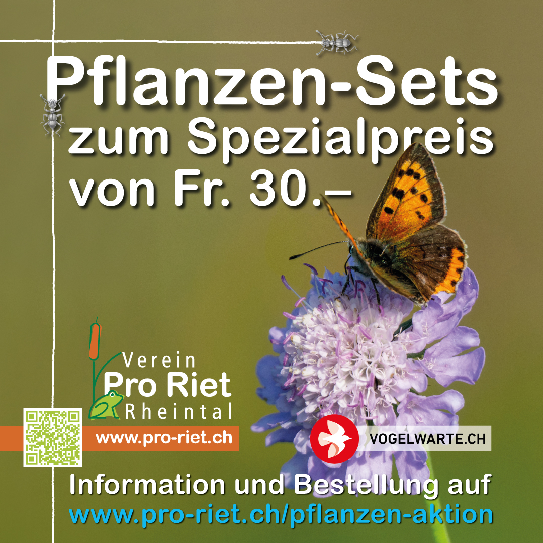 Die beliebte Pflanzen-Aktion von Pro Riet ist wieder gestartet. Interessierte Gartenbesitzer sowie Naturfreunde können ab sofort Wildblumen- und Sträucher-Sets zum Spezialpreis von 30 Franken auf www.pro-riet.ch/pflanzen-aktion bestellen. Die Abholung erfolgt am Freitag, 7.